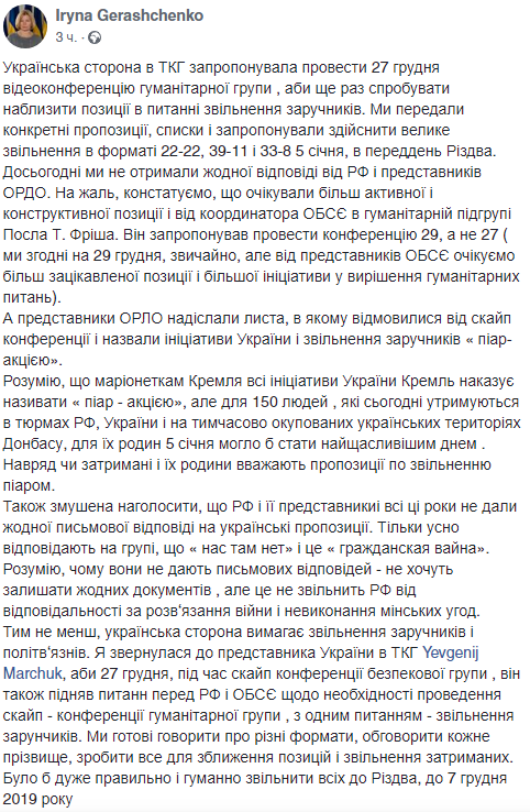 Она отметила, что украинская сторона всячески пыталась донести до российской стороны то, что необходимо провести обмен пленными в предрождественский период, предлагалось провести видеоконференцию, на которой должны были высказаться все стороны.