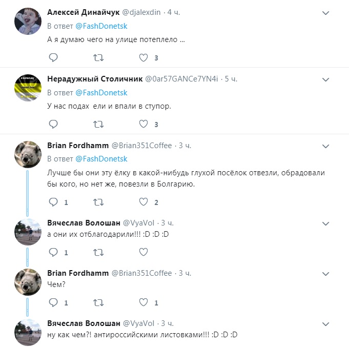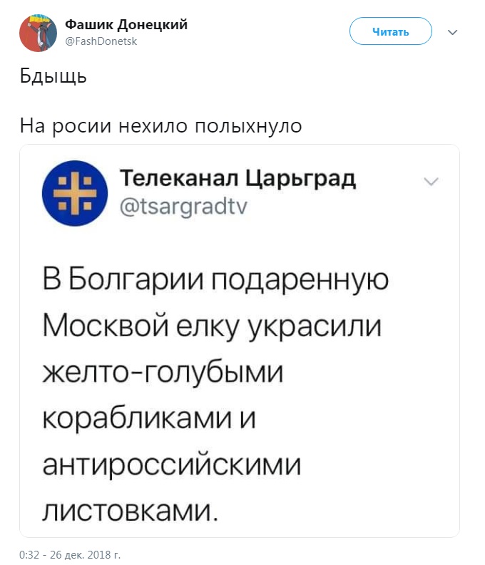 Желтые и синие корабли и лозунги с призывом освободить моряков на елке, которую подарила Россия Болгарии, вызвали у пропагандистов ярость. Российские СМИ принялись язвительно писать про "дурь украинских активистов" и "хулиганские выходки" в Софие.