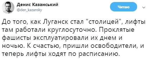 Комментируя новый "прорыв" террористов журналист Денис Казанский отметил, что до оккупации лифты, в том числе и в "столице" "ЛНР", работали без отключений.