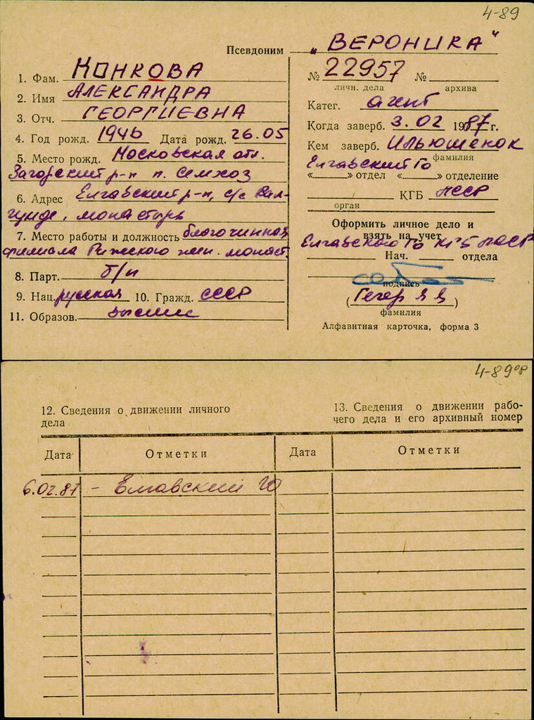 Удалось выяснить, что Конкова родилась под Москвой, потом поступила в Рижский монастырь, где через год была пострижена. Женщина была завербована сотрудниками КГБ в 87 году под кличкой Вероника.
