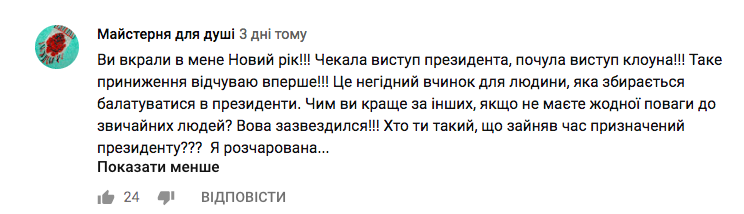 "Мерзость! Вот ощущение от новогоднего выпуска! Вы, ребята, либо слишком заигрались, и корона сдавила мозг, либо продались", - отметил один из комментаторов. Особенно украинцев возмутила насмешка Зеленского над Томосом - великим моментом в истории Украины.