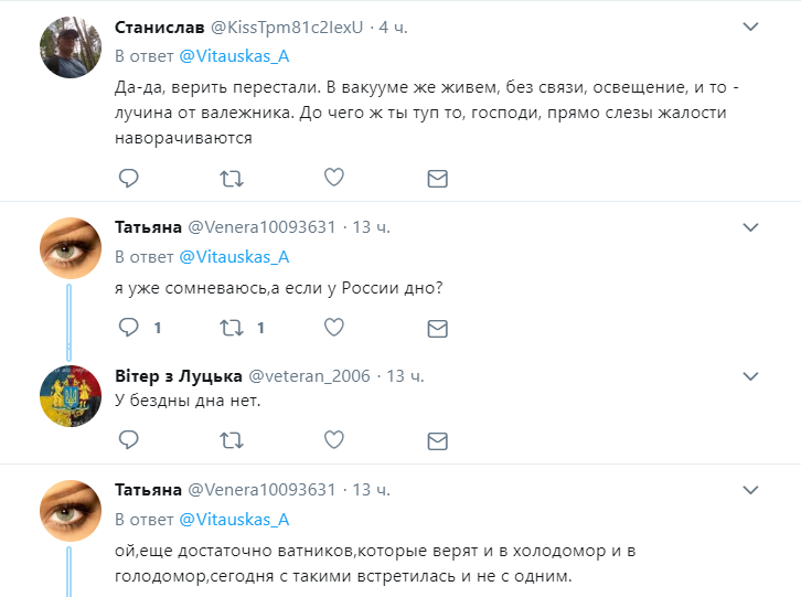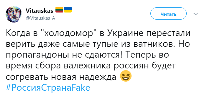 "Когда в "холодомор" в Украине перестали верить даже самые тупые из ватников, но пропагандоны не сдаются! Теперь во время сбора валежника россиян будет согревать новая надежда", - пишут в сети.