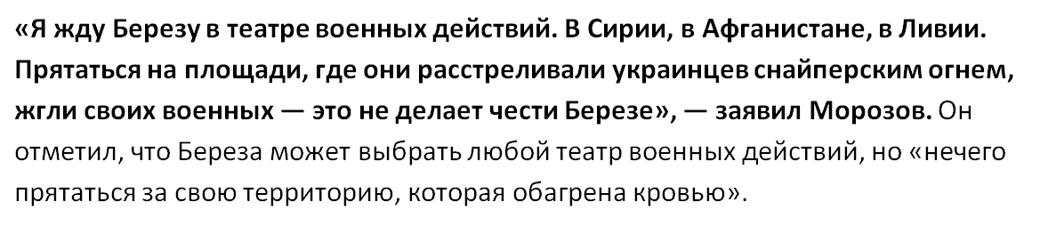 Морозов заявил, что готов встретиться с Березой на войне - в Сирии, в Афганистане, в Ливии. При этом ответ о том, почему он не готов ехать в Киев, так никто и не понял.