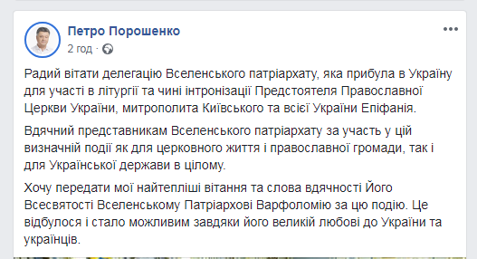 "Рад приветствовать делегацию Вселенского патриархата, которая прибыла в Украину для участия в литургии и чине интронизации предстоятеля Православной церкви Украины, митрополита Киевского и всей Украины Епифания", - написал глава государства.