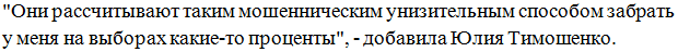 Тимошенко подчеркнула, что ее однофамилец Тимошенко является исключительно техническим кандидатом, за которым якобы "стоит" действующий президент Украины Петр Порошенко.