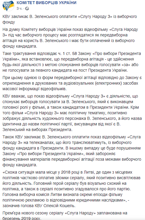 В Комитете пояснили, что кандидат должен заплатить телеканалам за публикацию данных материалов, иначе это можно расценить как нарушение закона. Напомним, премьера "Слуги народа 3" планируется на март 2019 года.