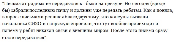 Кроме того, тюремщики не хотят принимать от Терещенко обращения, где он называет себя военнопленным, и вынуждают моряка писать о себе как о "содержащемся в СИЗО". Однако парень не падает духом, хорошо держится и шутит.