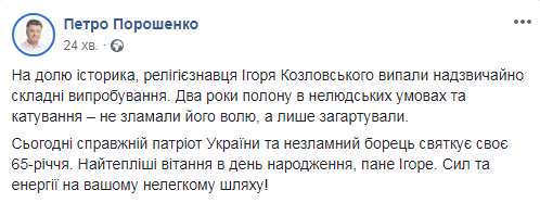 "На долю историка, религиоведа Игоря Козловского выпали сложнейшие испытания. Два года плена в нечеловеческих условиях и пытки не сломили его волю, а только закалили", - отмечает глава государства.