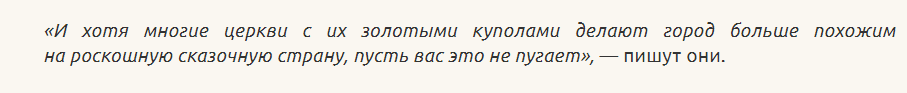 Рейтинг составляла известная туристическая компания в Германии. Описывая достопримечательности Матери городов русских, там сравнили город с "роскошной сказочной страной" из-за золотых куполов церквей и соборов.
