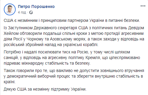 А Хейл подчеркнул "значительный прогресс, которого достигла Украина за последние годы в условиях российской агрессии", и заверил Порошенко в неизменной поддержке США.