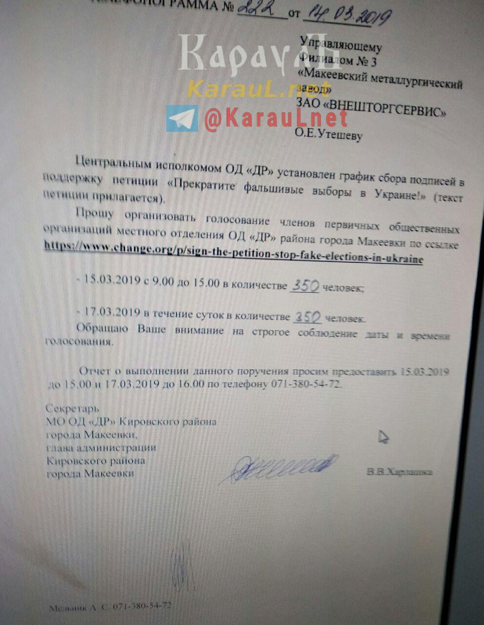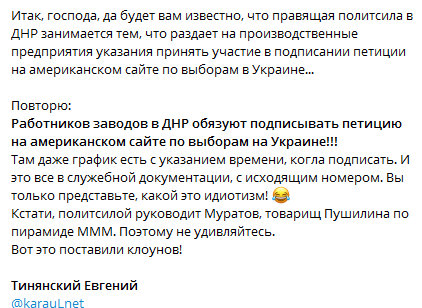 Блогер сообщает, что работников заводов в "ДНР" " обязуют подписывать петицию на американском сайте по выборам на Украине!!! Там даже график есть с указанием времени, когда подписать. И это все в служебной документации, с исходящим номером", - возмущен Тинянский.