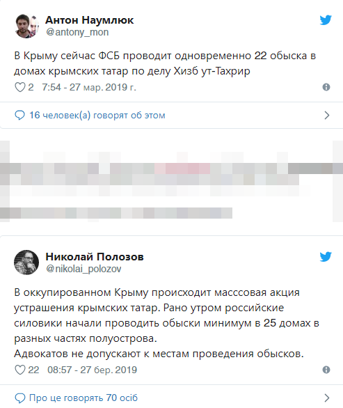 Утром, 27 марта, журналист Антон Наумлюк сообщил о 22 обысках в Симферополе и Белогорском районе. Позже адвокат Николай Полозов сообщил об обысках "минимум в 25 домах" и назвал это "масссовой акцией устрашения крымских татар". Отмечается, в ФСБ рассказали, что данные обыски начались из-за организации "Хизб ут-Тахрир аль-Ислами", которая признана террористической в РФ.
