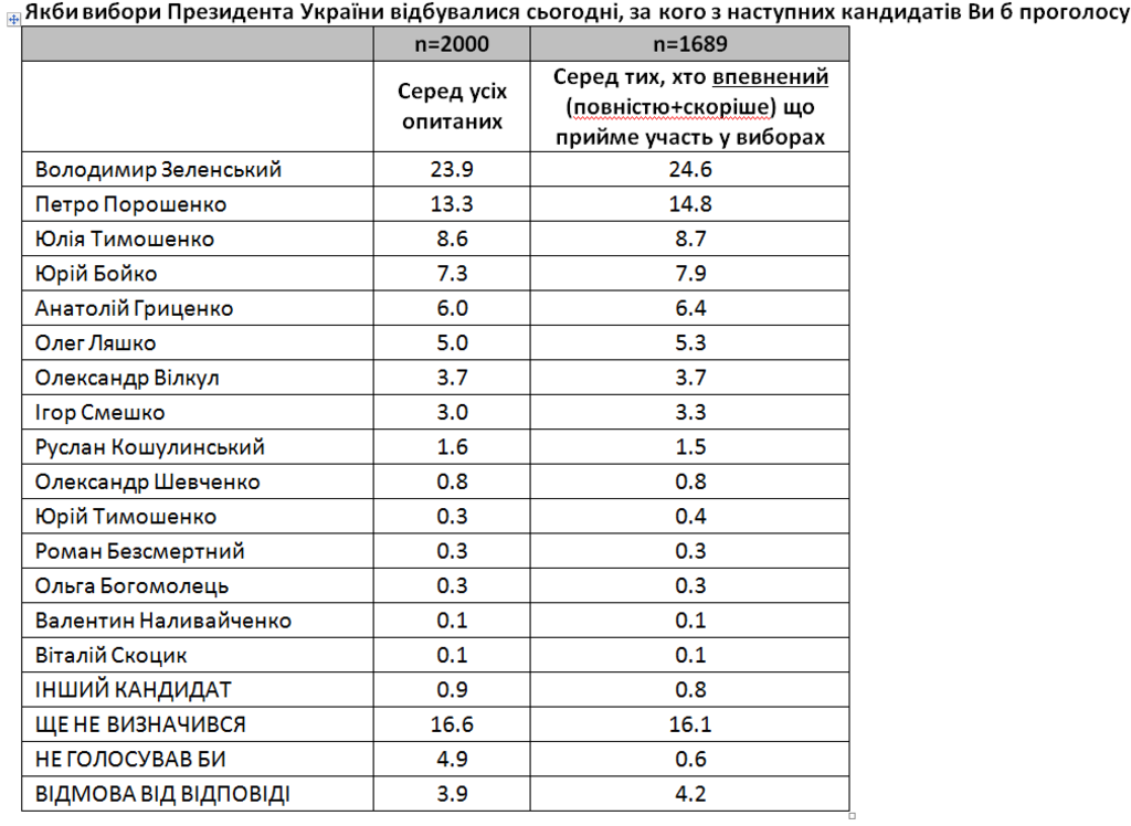 За Зеленского намерены голосовать 24,6 процента избирателей. Это те люди, которые полностью или скорее уверены, что примут участие в выборах. Порошенко в этой категории поддерживают 14,8%, а Тимошенко — 8,7%.
