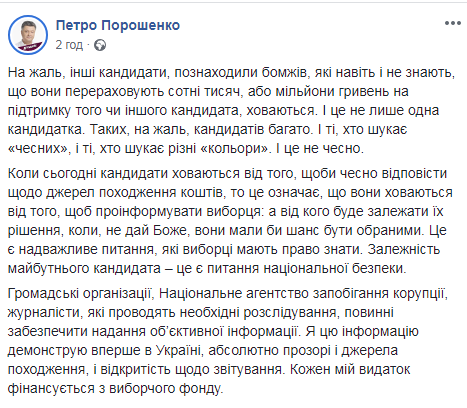"Они скрываются от того, чтобы проинформировать избирателя: а от кого будет зависеть их решение, когда, не дай Бог, они имели бы шанс быть избранными. Избиратели имеют право знать. Зависимость будущего кандидата - это вопрос национальной безопасности", - резюмировал Порошенко.