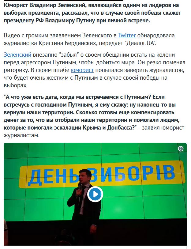 Таким образом представитель "Зе" дал понять, что все его слова в импровизированном "обращении к Путину" и обнадеживающая риторика по поводу мира на Донбассе и возвращения "отжатых" территорий - не более, чем предвыборный популизм. На самом же деле, скорого возвращения Донбасса и Крыма при Зеленском не будет.