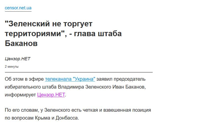 Глава предвыборного штаба Владимира Зеленского Иван Баканов в эфире телеканала "Украина" фактически поставил точку на обещаниях "Зе" по поводу Крыма и Донбасса - передает Цензор.нет