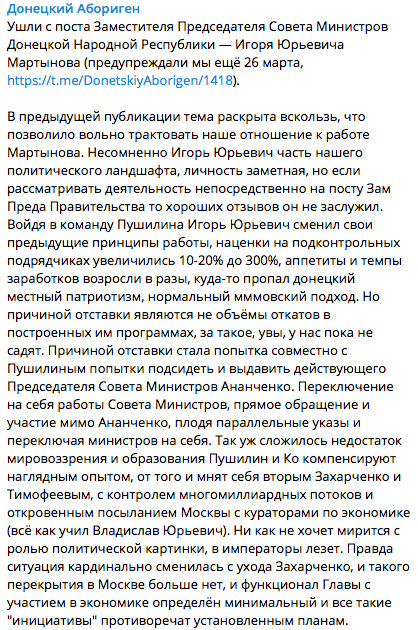 Однако главной причиной "зачистки" стали попытки Мартынова вместе с Пушилиным "подсидеть" председателя "совмина" Ананченко, с которым Москва, по всей видимости, расставаться не намерена.
