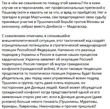 "Какой может обсуждаться "гражданский конфликт", когда представителей одной из его заявленных сторон уже нет, если в Донецке донецких (даже условно) больше некого показать (Пушилины, Муратовы, Крамары, Лавреновы, Никоноровы и прочие пришлые)?" - возмущается "Донецкий Абориген".