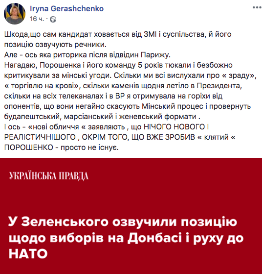 "Порошенко и его команду 5 лет тюкали и безбожно критиковали за Минские соглашения. Сколько мы все выслушали об "измене", "торговле на крови", сколько камней ежедневно летело в президента, сколько на всех телеканалах и в ВР я получала на орехи от оппонентов, что они немедленно отменят Минский процесс и вернут будапештский, марсианский и женевский форматы. И вот - "новые лица" заявляют, что НИЧЕГО НОВОГО и реалистичного, КРОМЕ ТОГО, ЧТО УЖЕ СДЕЛАЛ "проклятый" Порошенко - просто не существует", - возмутилась Геращенко.