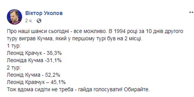 Уколов напомнил, что в 1994 году Леонид Кучма выиграл второй тур, хотя после первого был на втором месте.