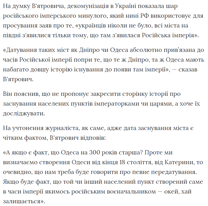 Кроме того, Вятрович уверяет, что такие города, как Одесса или Днепр, были основаны гораздо раньше, чем об этом утверждает история России.