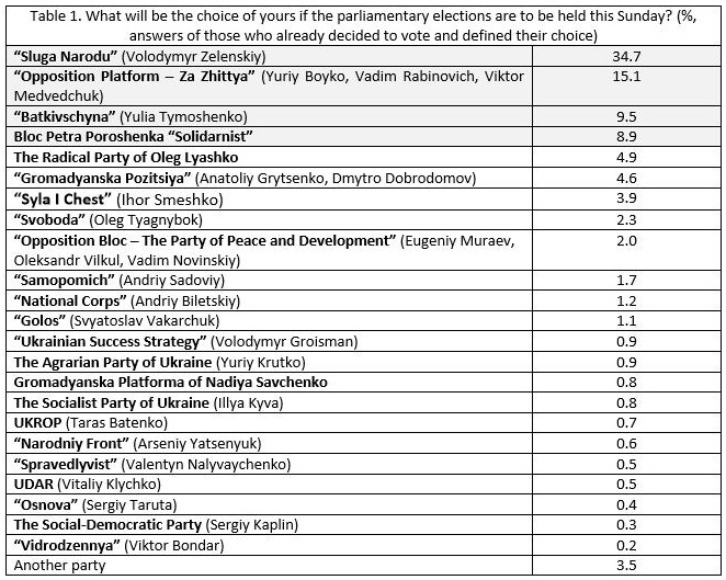 Согласно проведенному опросу, в новый Парламент по старому законодательству пройдет лишь четыре партии, среди них: партия "Слуга народа" Владимира Зеленского (34,7%), "Оппозиционная платформа - За жизнь" Юрия Бойко, Вадима Рабиновича и Виктора Медведчука (15,1%), "Батькивщина" Юлии Тимошенко (9,5%) и "Блок Петра Порошенко "Солидарность" (8,9%).