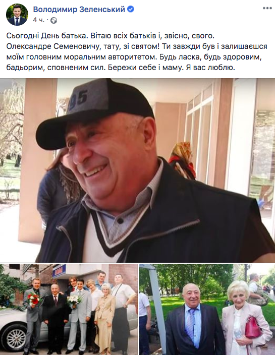 Сегодня, 16 июня, весь мир празднует День отца. Зеленский по этому поводу выступил в соцсети с сообщением, в котором поздравил с праздником своего родителя - Александра Зеленского.