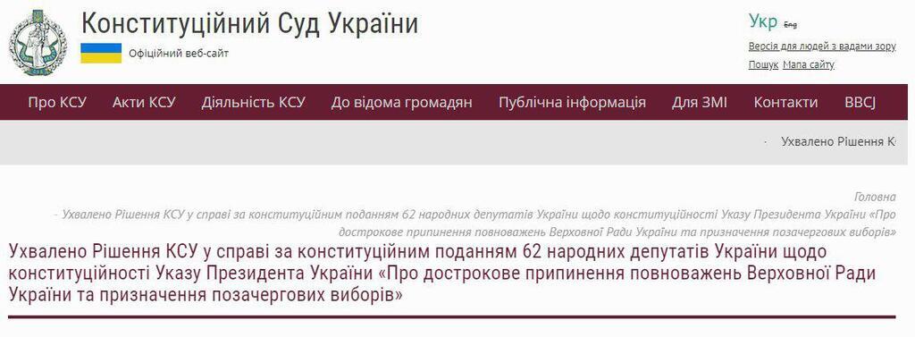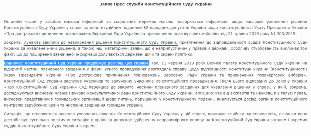 Однако ближе к вечеру на сайте КСУ появилось сообщение о том, что суд продолжает рассмотрение указа Зеленского о роспуске Верховной Рады. Особую обеспокоенность КСУ выразил в связи с резонансной реакцией на решение о досрочных выборах.