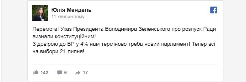 Спикер Зеленского Юлия Мендель тут же поздравила президента с победой, но почти сразу удалила свой пост.