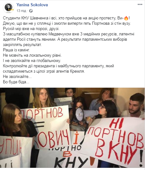 "Студенты КНУ Шевченко и все, кто пришли на акцию протеста, Вы - огонь! Спасибо, что вы не в спячке и смогли выставить вон Портнова из стен вуза. Русский мир уже на пороге, друзья", - написала журналистка.