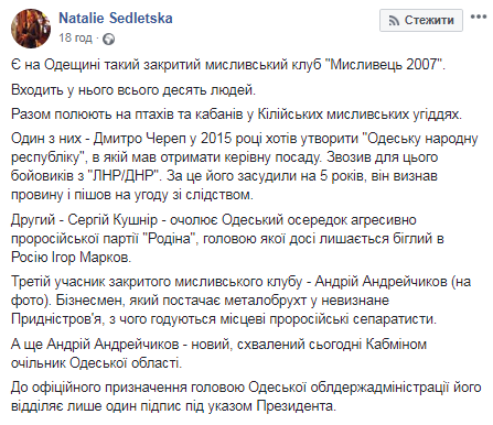 По ее данным, будущий глава Одесской области является членом закрытого охотничьего клуба "Охотник 2007".