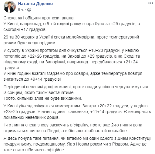 Погода в Украине на выходных, 29-30 июня, будет сухой и солнечной, однако местами возможны кратковременные дожди.