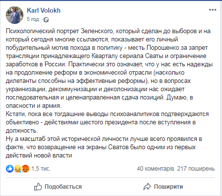 Блогер Карл Волох опубликовал на своей странице в Facebook пост об ошибках Владимира Зеленского на посту президента Украины, пишет "Диалог.UA":