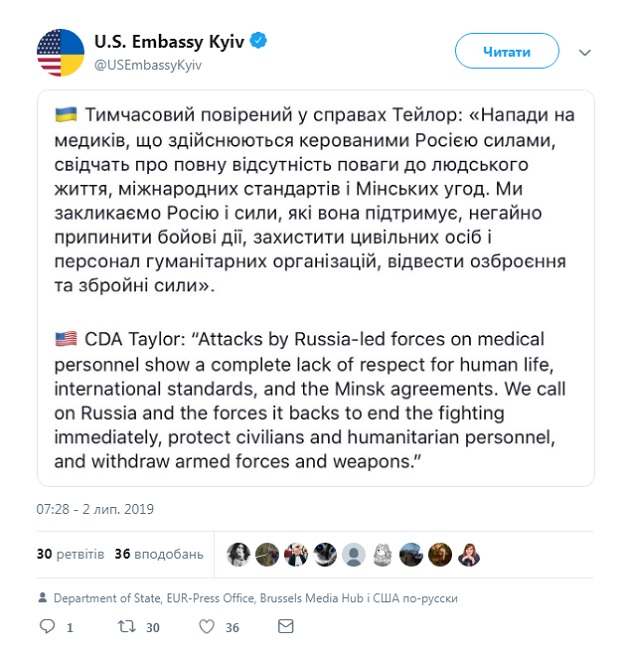 По словам Тейлора, нападение на медиков, осуществляемых управляемыми Россией силами, свидетельствуют о полном отсутствии уважения к человеческой жизни, международных и Минских соглашений.