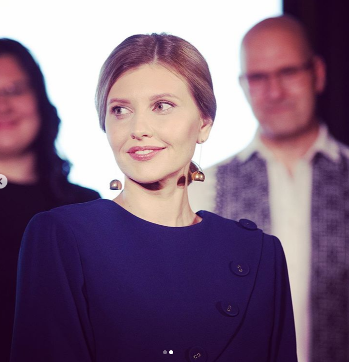 Елена Зеленская яркое фото показала в своем официальном Instagram. Жена президента была одета в темно-синее платье, которое спереди украшали крупные пуговицы.