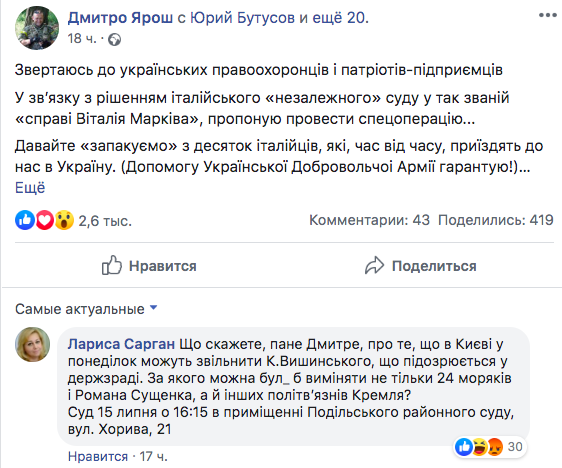 Сарган обратилась через Facebook к депутату Рады Дмитрию Ярошу по поводу Вышинского. Она в комментариях предупредила его, что Вышинский, помогавший Кремлю вести против Украины информационную войну, может выйти на свободу уже в самое ближайшее время.