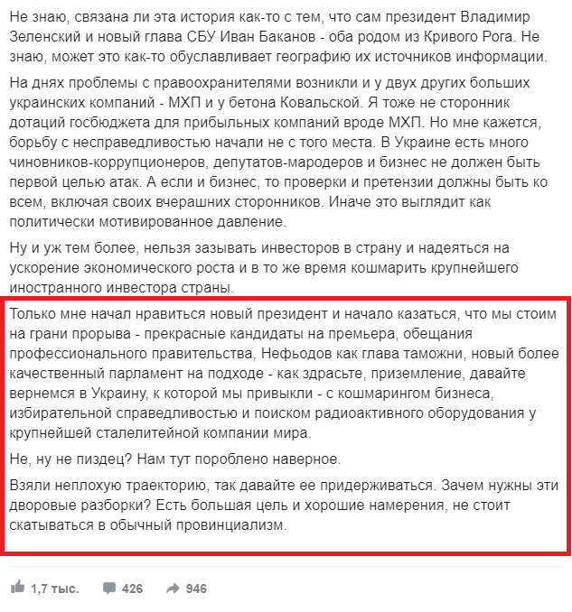 "Не знаю, связана ли эта история как-то с тем, что сам президент Владимир Зеленский и новый глава СБУ Иван Баканов - оба родом из Кривого Рога. Не знаю, может это как-то обуславливает географию их источников информации… Не, ну не пиз*ец? Нам тут пороблено, наверное", - написал журналист на своей странице в социальной сети, не подбирая слов с критикой в адрес Зеленского.