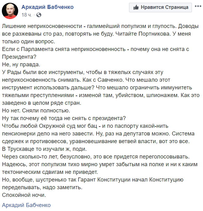 Известный российский журналист Аркадий Бабченко раскритиковал снятие депутатской неприкосновенности и задал властям Украины единственный вопрос, почему неприкосновенность не сняли с президента Владимира Зеленского. Об этом он написал на своей странице в социальной сети.