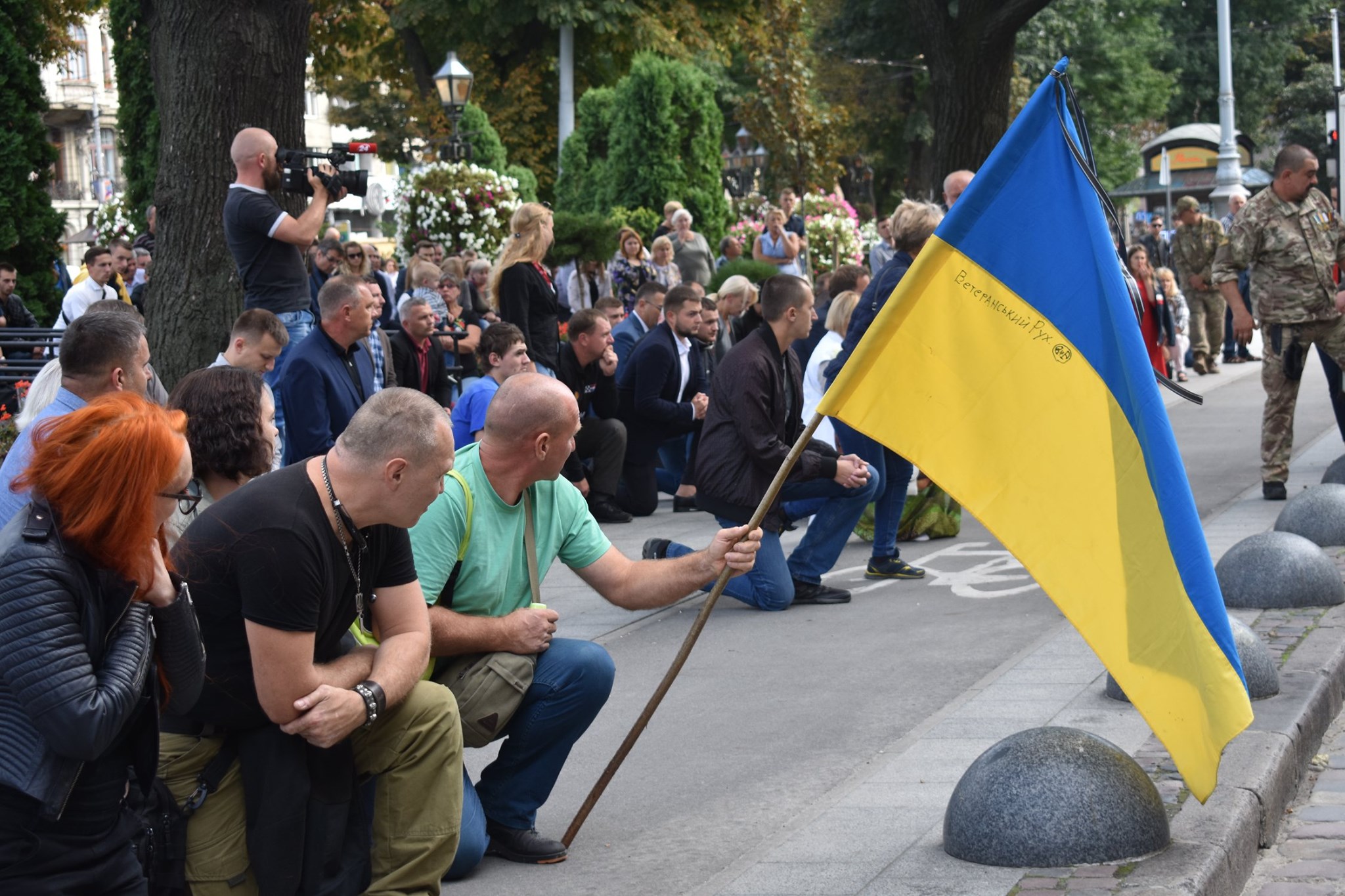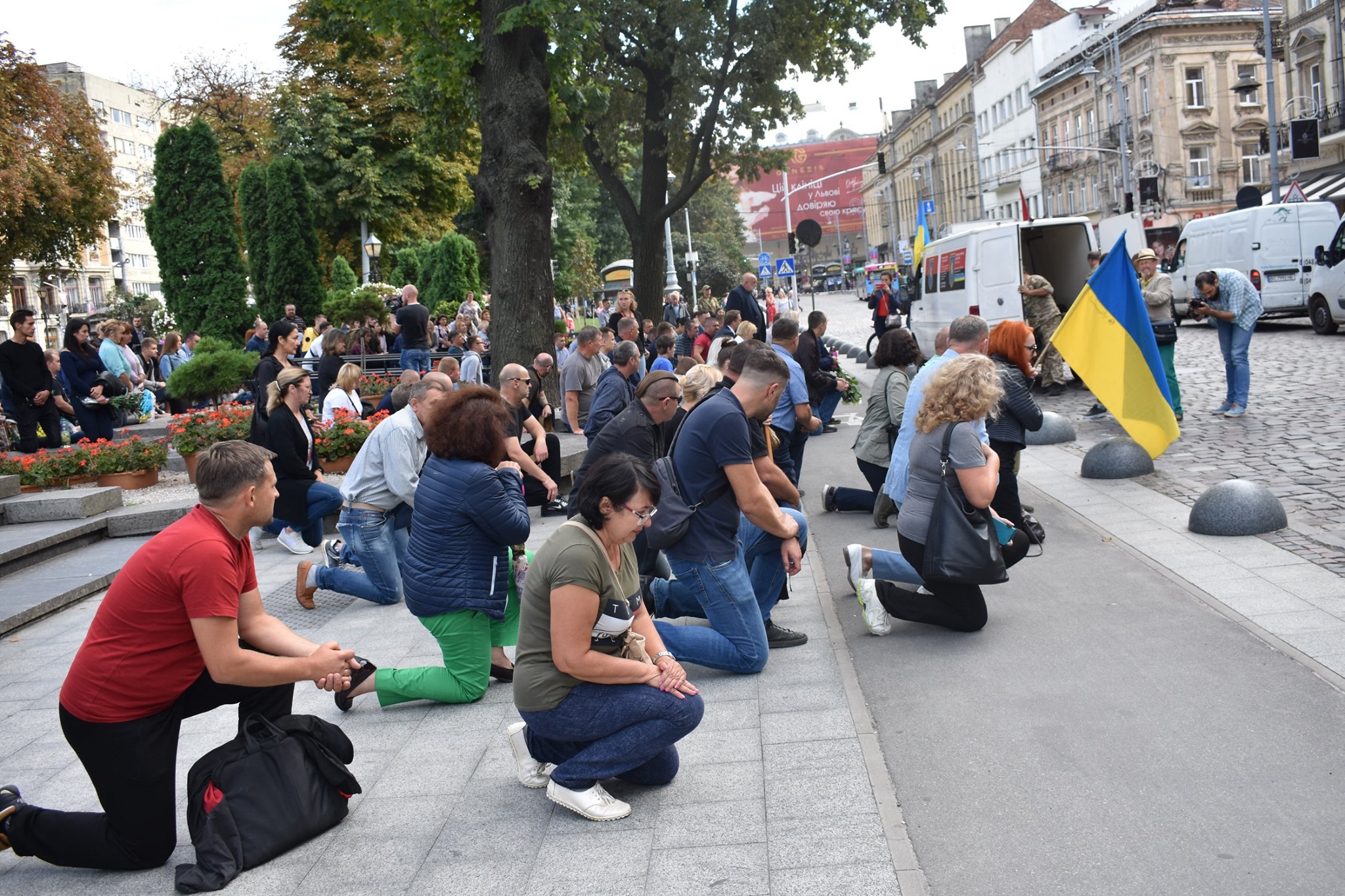 Как видно на опубликованных фото и видео, попрощаться с погибшим военным пришло множество жителей Львова. Они встречали тело военного на коленях.