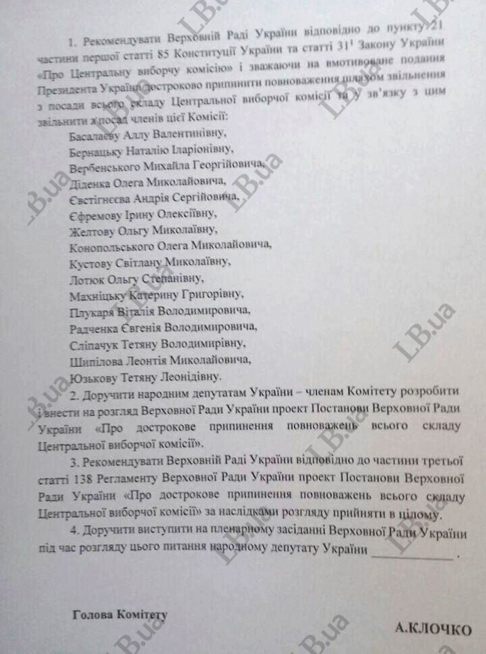 Согласно опубликованной информации комитет парламента рекомендовал парламенту досрочно прекратить полномочия всех членов ЦИК.