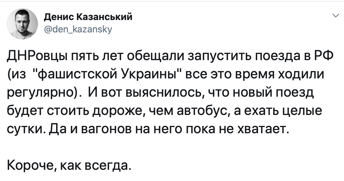 Многолетние "потуги" "ДНР" запустить железнодорожное сообщение с Россией в Сети восприняли с иронией. В частности, украинский журналист Денис Казанский напомнил, что сепаратисты уже пятый год обещают запустить-таки железнодорожное сообщение с Россией. Кроме того, блогер напомнил, что из "фашистской Украины" все это время поезда ходят исправно.