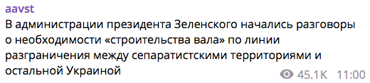 "В администрации президента Зеленского начались разговоры о необходимости "строительства вала" по линии разграничения между сепаратистскими территориями и остальной Украиной", - написал главред "Эхо Москвы". Это важный сигнал. Очевидно, что Кремль данная новость сильно взволновала.