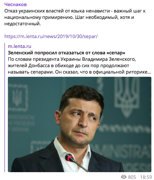 Чеснаков похвалил Зеленского за призыв к украинцам отказаться от слова "сепар" в отношении жителей, оккупированных Россией и ее террористами "Л/ДНР". Украинский лидер сделал такое заявление на форуме в Мариуполе 30 октября.