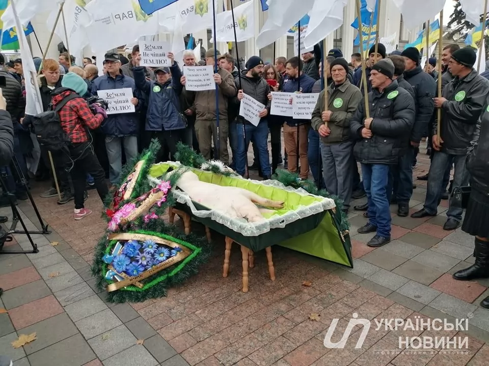 На площади перед Парламентом протестует большое количество людей с флагами различных политических партий. Они выступают против снятия моратория на продажу земли. При этом организаторы акции заявили, что свинья в гробу символизирует упадок фермерства в Украине, который обязательно наступит после снятия моратория на продажу земли.