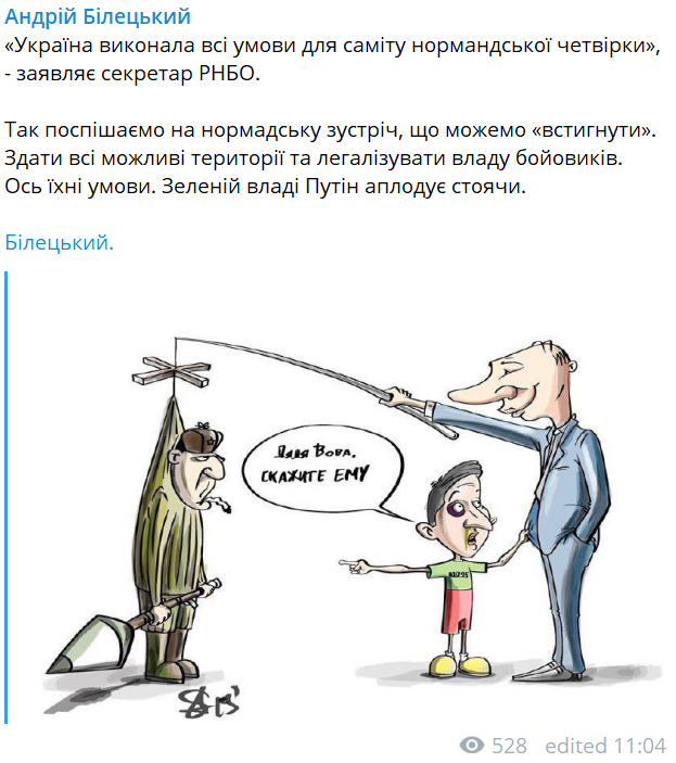 Так спешим на нормандскую встречу, что можем успеть. Сдать все возможные территории и легализовать власть боевиков. Вот их условия. Зеленой власти Путин аплодирует стоя", - написал он.