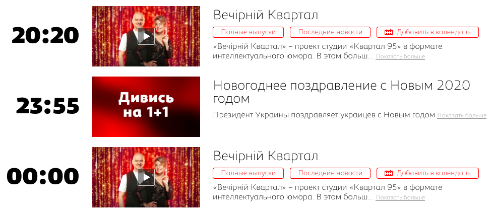 Согласно телепрограмме "1+1", начнется видеообращение Зеленского в 23:55. Вместо "Голубого огонька" развлекать телезрителей будет "Вечерний квартал", информирует Диалог.UA.