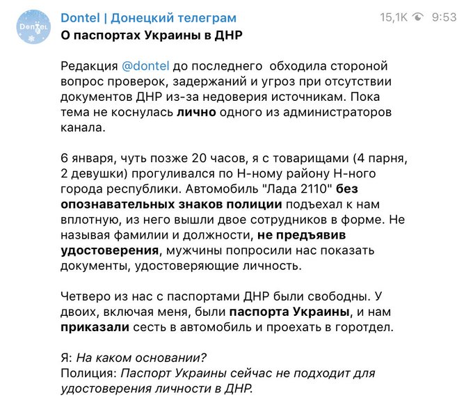 Казанский также показал сообщение о том, как поступают с людьми, у которых нет при себе так называемого паспорта "ДНР".