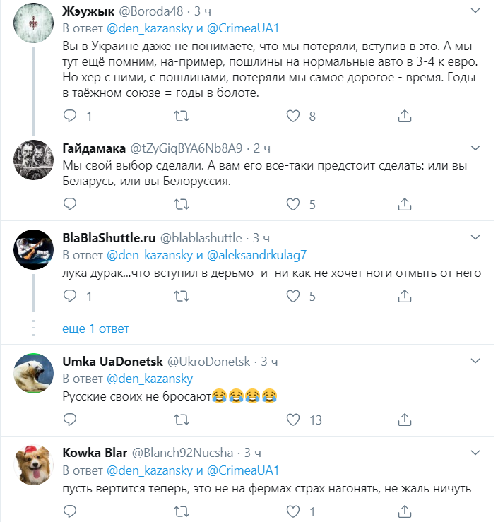 "Вы в Украине даже не понимаете, что мы потеряли, вступив в это. А мы тут ещё помним, например, пошлины на нормальные авто в 3-4 к евро. Но х*р с ними, с пошлинами, потеряли мы самое дорогое - время. Годы в таёжном союзе = годы в болоте", - ответил ему житель Беларуси.