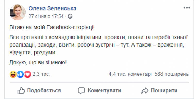 Журналисты сообщают, что на странице Зеленской на данный момент находится всего 1 запись, а также несколько фотографий. Восстановленным оказался пост от 27 января, в котором она приветствует своих подписчиков на своей Facebook странице.