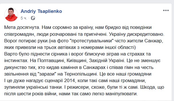 Вчера, 20 февраля, в протестах, которые происходили в Новых Санжарах, участвовали не только местные жители, но специально завезенные туда люди, которые активно выступали против действий полиции. Украинский журналист Андрей Цаплиенко в блоге подчеркивает, что именно по таким методичкам разжигали конфликт между гражданами Украины в 2014 году.
